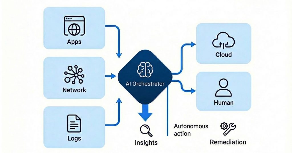 It uses ML, agentic AI and automated analytics to ingest telemetry, correlate events, predict issues and deliver real-time insights moving beyond dashboards to AI-generated insights and recommendations.