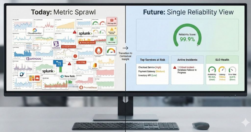 | Today: Metric Sprawl with Many Tools | Future: Single Reliability View |